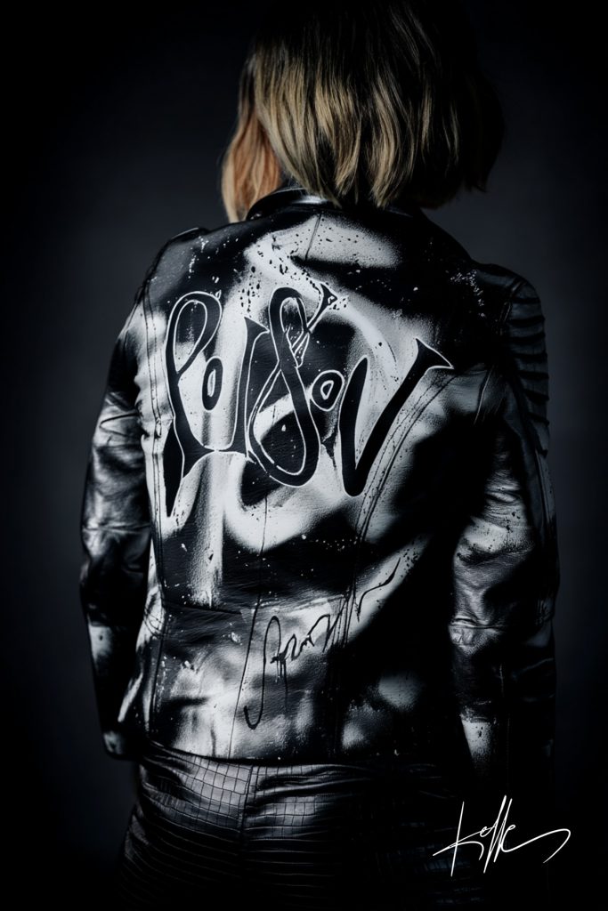 This hand-painted leather jacket was transformed into a bold monochrome statement piece through layers of white spray paint and expressive calligraphy. The raw spray technique creates dynamic contrast and depth, while the custom lettering adds individuality and meaning, turning the garment into a living canvas.