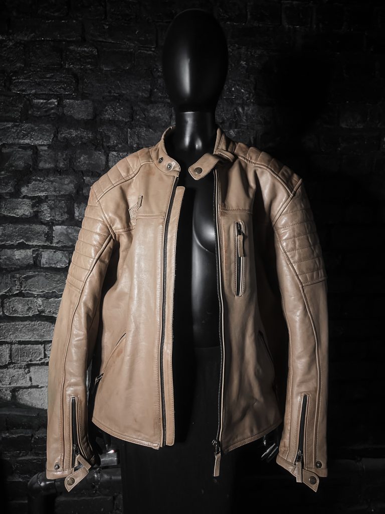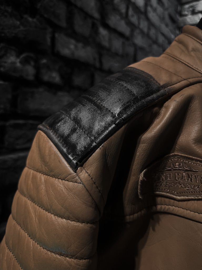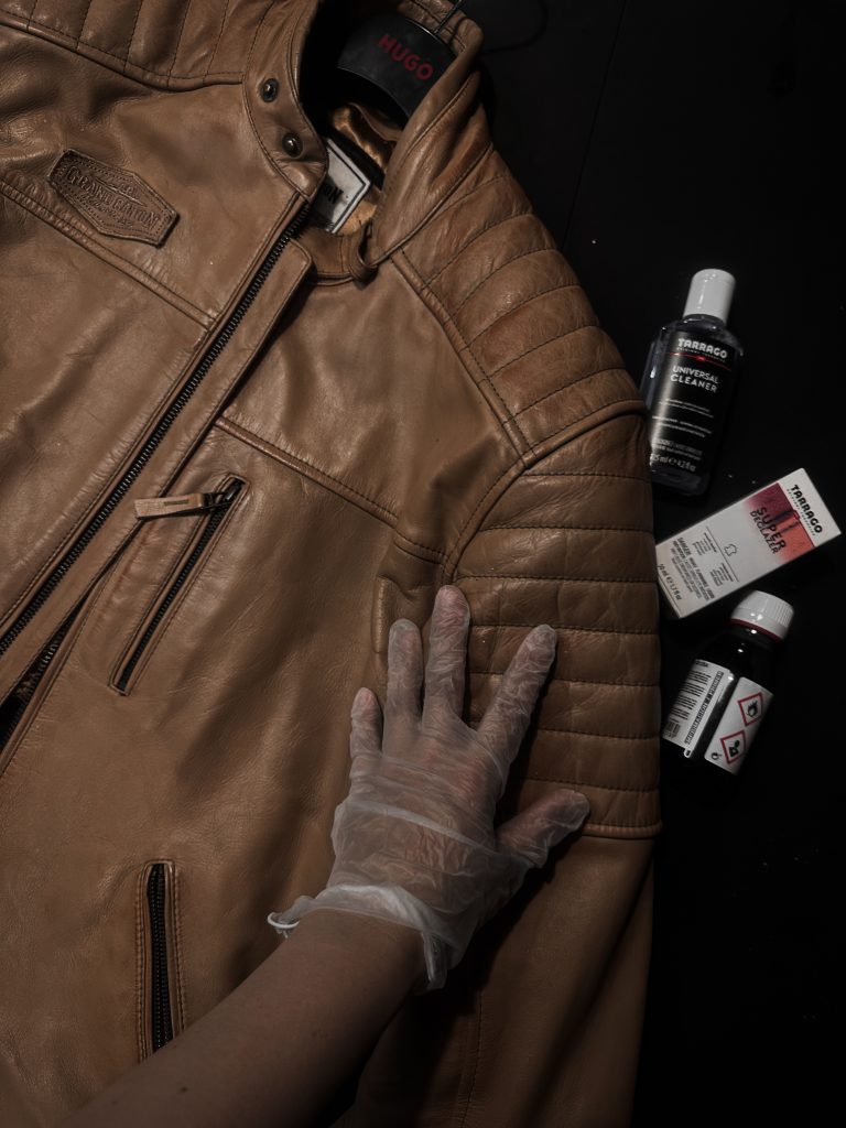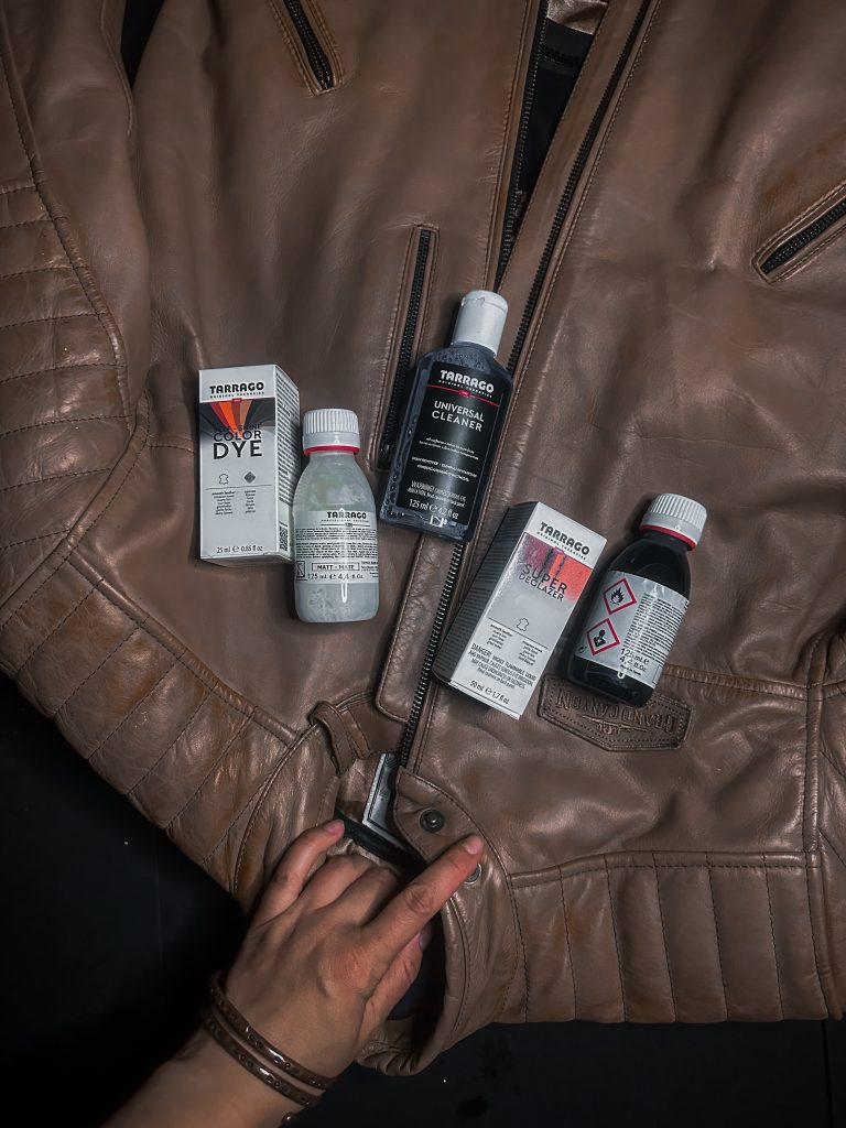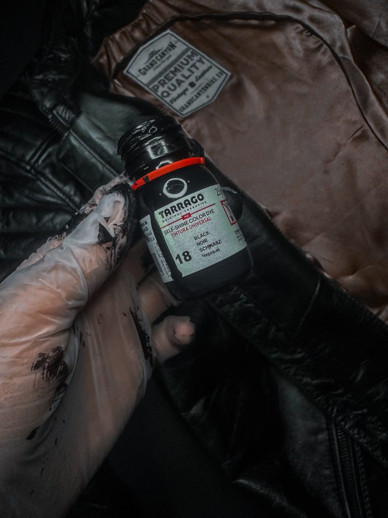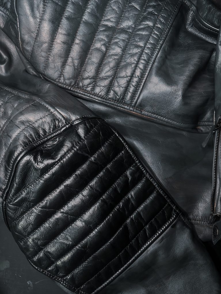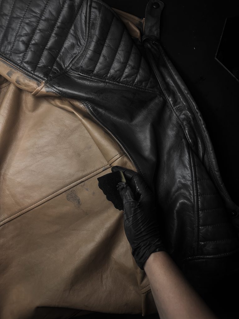 Because this motorcycle jacket was destined for the road, the dyeing process required careful preparation. The preparation took weeks of research, cleaning, and testing, ensuring the finish would remain permanent and resistant to wear.