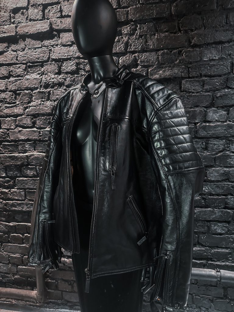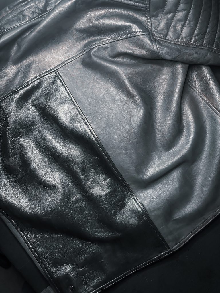 This leather motorcycle jacket underwent a complete transformation, beginning with an intricate hand-dyeing process that turned the original beige leather into a deep, even black.
