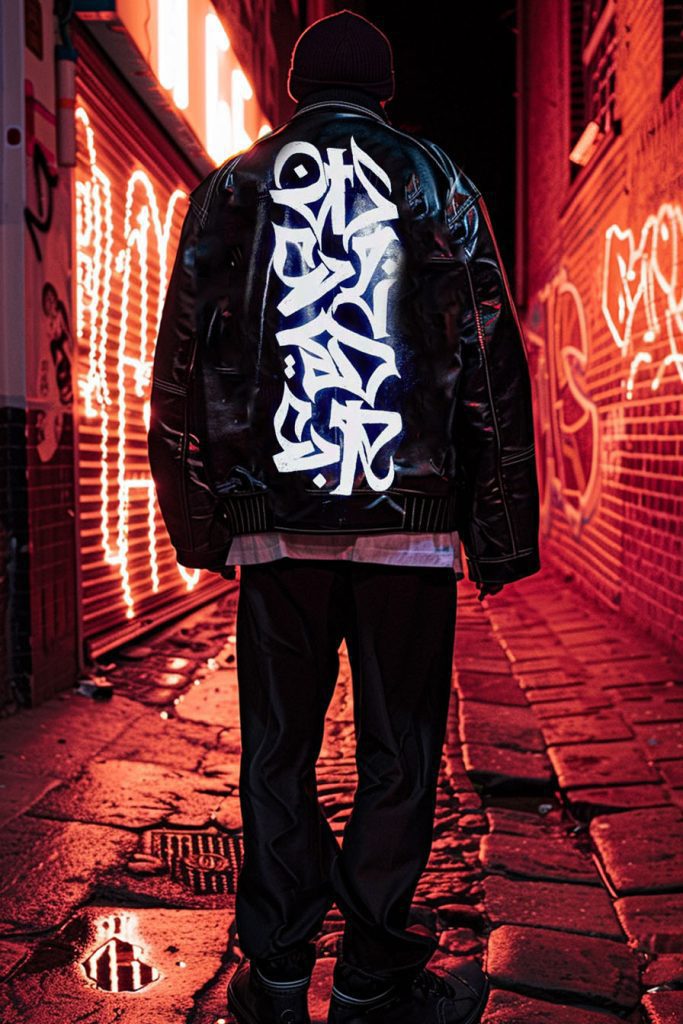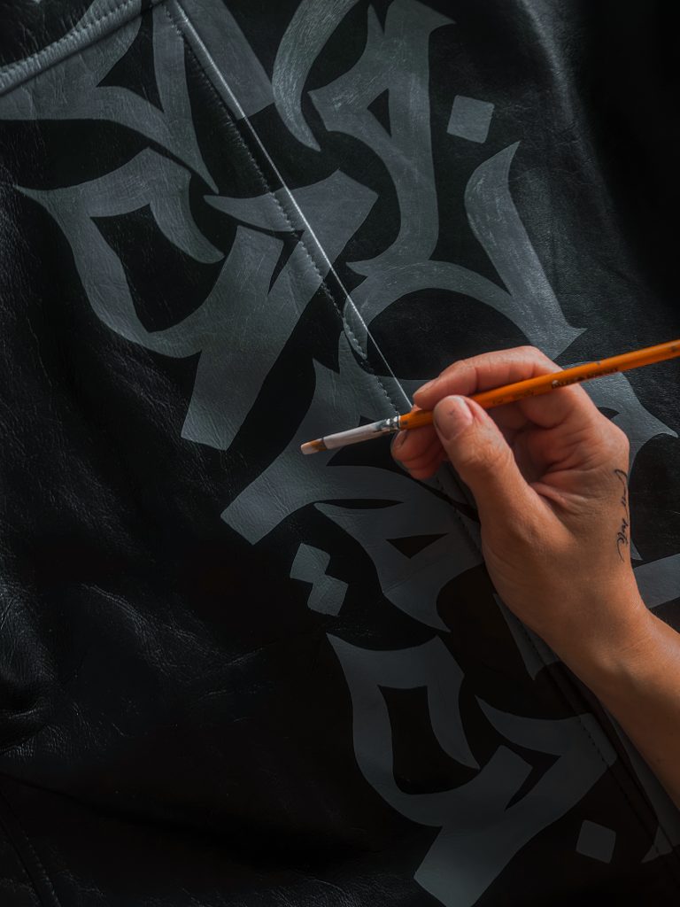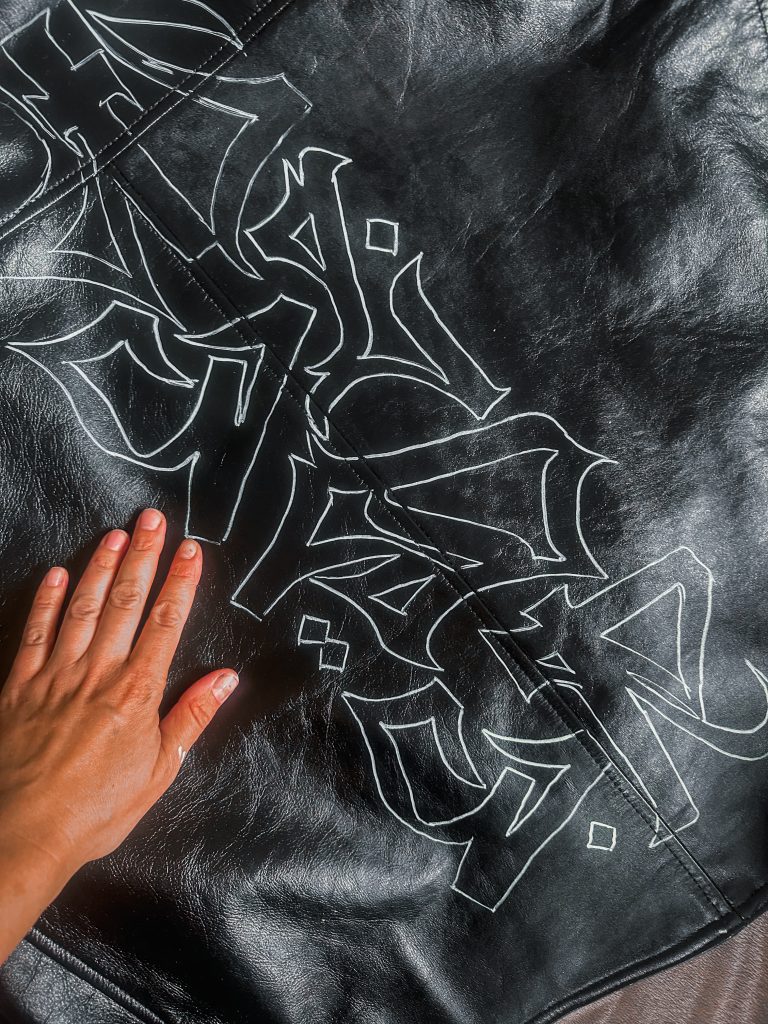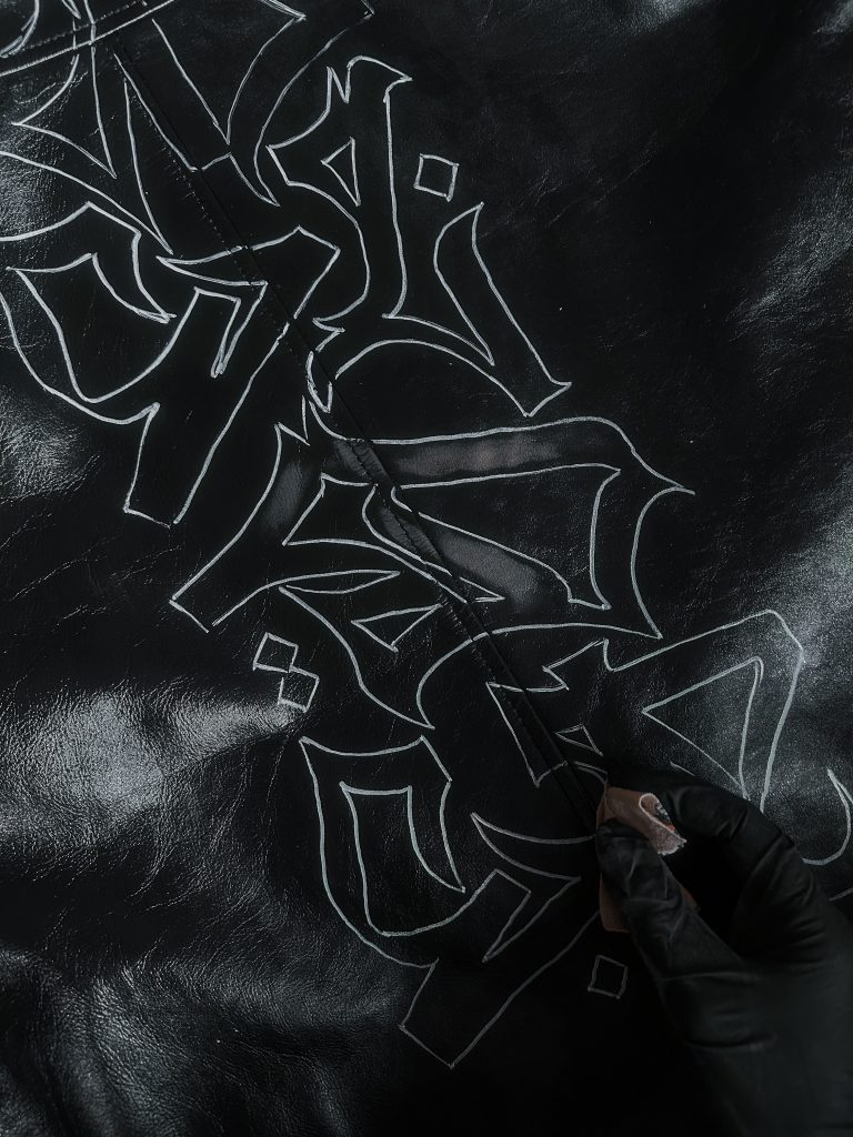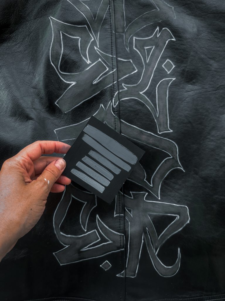 Once the base was perfected, the artwork took shape. A custom calligraffiti was created by hand that reads “Welder.” The design was layered with reflective paint that glows under headlights at night. Reflective elements were also extended onto the seams, adding both a stylistic edge and functional visibility.
